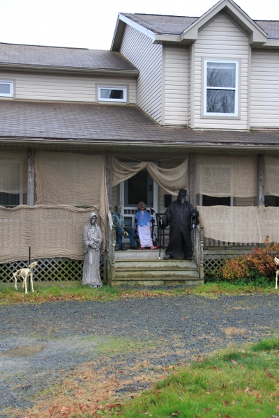 The view of the porch. Mother Nature threatened to rain, so we protected Granny & Gus with burlap.