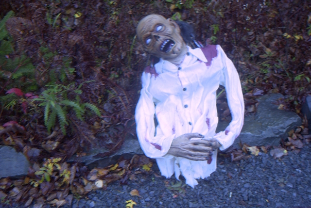 Zombie hangs from a post in the lane