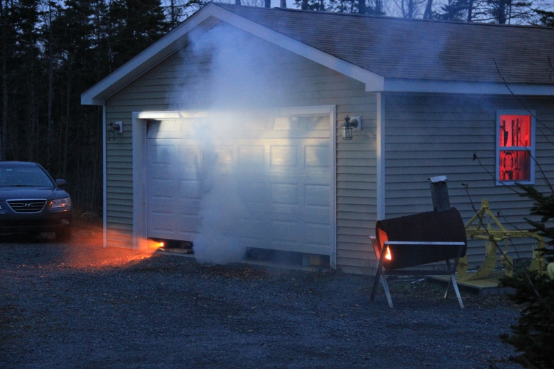 A red light glows from inside the garage. It's still too light out to see the shadows